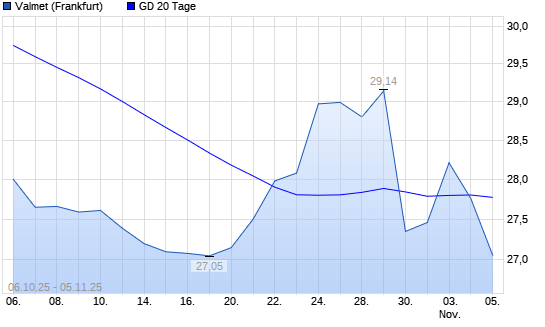 Mit dem Rücksetzer auf 27,76 EUR hat die Valmet-Aktie am 04.11.2025 die 20-Tage-Linie nach unten gekreuzt.
