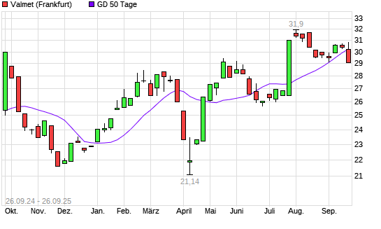 Mit dem Rücksetzer auf 30,00 EUR hat die Valmet-Aktie am 25.09.2025 die 50-Tage-Linie nach unten gekreuzt.