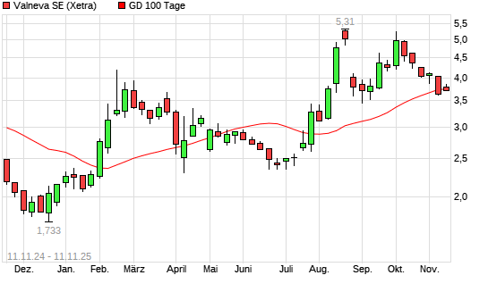Mit dem Anstieg auf 3,77 EUR hat die Valneva-Aktie am 10.11.2025 die 100-Tage-Linie nach oben gekreuzt.