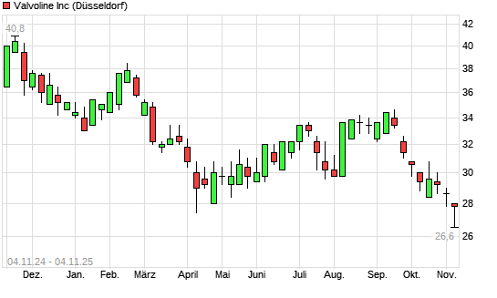 Mit dem Rücksetzer auf 27,40 EUR hat die Valvoline-Aktie (ISIN US92047W1018) am 03.11.2025 ein neues 3-Jahres-Tief erreicht und damit den Kurs vom 30.10.2023 eingestellt.