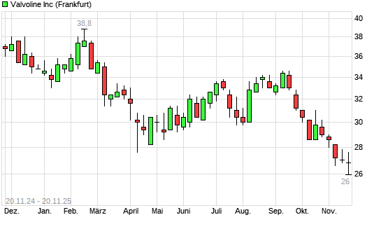 Mit dem Rücksetzer auf 26,80 EUR hat die Valvoline-Aktie (ISIN US92047W1018) am 19.11.2025 ein neues 3-Jahres-Tief erreicht und damit den Kurs vom 06.11.2025 eingestellt.