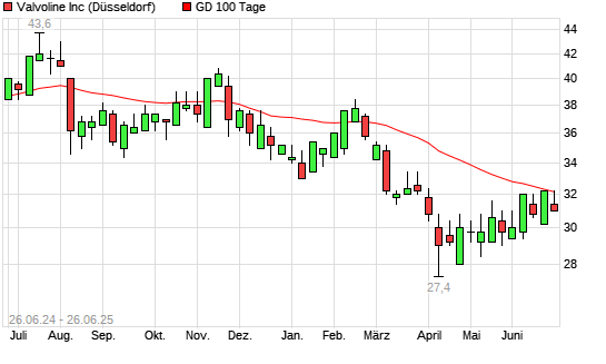 Mit dem Rücksetzer auf 31,60 EUR hat die Valvoline-Aktie am 25.06.2025 die 100-Tage-Linie nach unten gekreuzt.