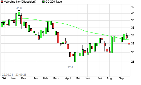 Mit dem Rücksetzer auf 31,80 EUR hat die Valvoline-Aktie am 22.09.2025 die 200-Tage-Linie nach unten gekreuzt.