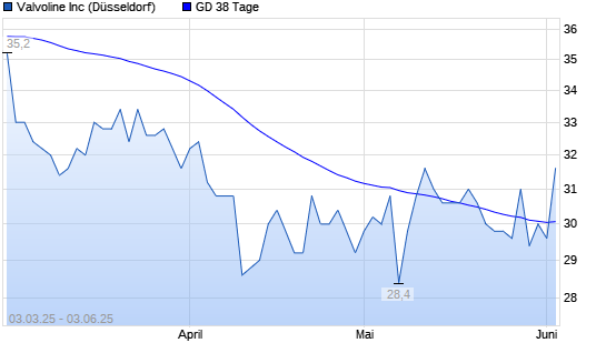 Mit dem Rücksetzer auf 30,00 EUR hat die Valvoline-Aktie am 02.06.2025 die 38-Tage-Linie nach unten gekreuzt.