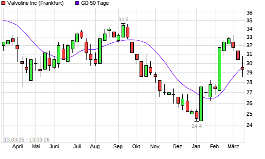 Mit dem Rücksetzer auf 29,40 EUR hat die Valvoline-Aktie am 12.03.2026 die 50-Tage-Linie nach unten gekreuzt.