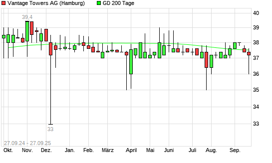 Mit dem Rücksetzer auf 37,20 EUR hat die Vantage Towers-Aktie am 26.09.2025 die 200-Tage-Linie nach unten gekreuzt.
