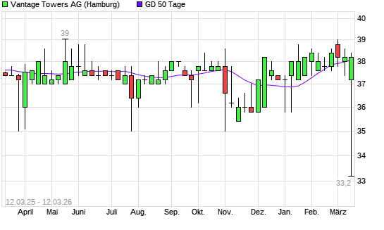 Mit dem Rücksetzer auf 37,80 EUR hat die Vantage Towers-Aktie am 11.03.2026 die 50-Tage-Linie nach unten gekreuzt.