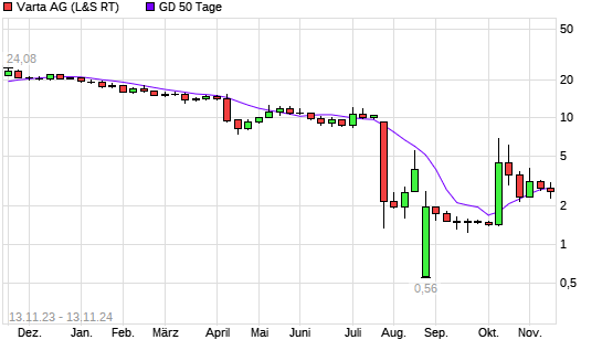 Mit dem Rücksetzer auf 2,39 EUR hat die Varta-Aktie am 12.11.2024 die 50-Tage-Linie nach unten gekreuzt.