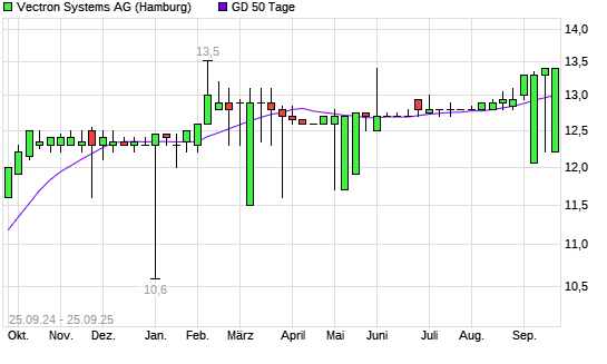 Mit dem Anstieg auf 13,40 EUR hat die Vectron Systems-Aktie am 24.09.2025 die 50-Tage-Linie nach oben gekreuzt.