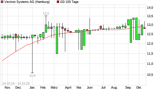 Mit dem Rücksetzer auf 12,80 EUR hat die Vectron Systems-Aktie am 13.10.2025 die 100-Tage-Linie nach unten gekreuzt.