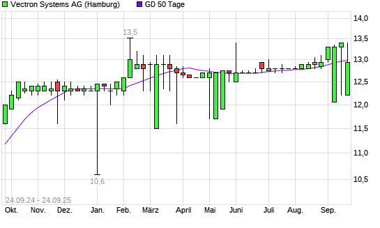 Mit dem Rücksetzer auf 12,90 EUR hat die Vectron Systems-Aktie am 23.09.2025 die 50-Tage-Linie nach unten gekreuzt.