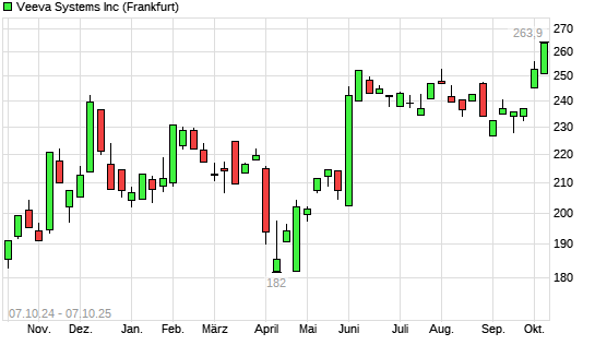Mit dem Anstieg auf 257,00 EUR hat die Veeva Systems A-Aktie (ISIN US9224751084) am 06.10.2025 ein neues 3-Jahres-Hoch erreicht und damit den Kurs vom 03.10.2025 eingestellt.