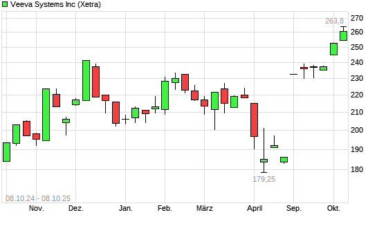 Mit dem Anstieg auf 263,90 EUR hat die Veeva Systems A-Aktie (ISIN US9224751084) am 07.10.2025 ein neues 3-Jahres-Hoch erreicht und damit den Kurs vom 06.10.2025 eingestellt.