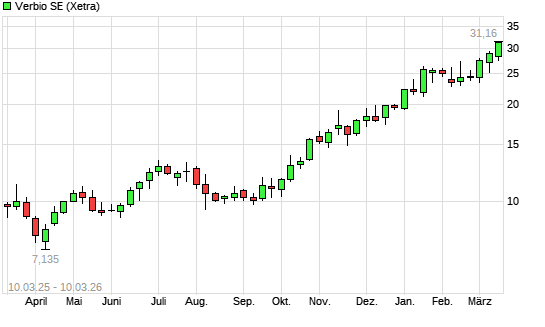 Mit dem Anstieg auf 28,72 EUR hat die Verbio Vereinigte Bioenergie-Aktie (ISIN DE000A0JL9W6) am 09.03.2026 ein neues 12-Monats-Hoch erreicht und damit den Kurs vom 06.03.2026 eingestellt.