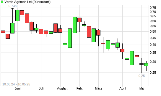 Mit dem Rücksetzer auf 0,26 EUR hat die Verde Agritech-Aktie (ISIN SGXZ27777630) am 09.05.2025 ein neues 3-Jahres-Tief erreicht und damit den Kurs vom 11.04.2025 eingestellt.
