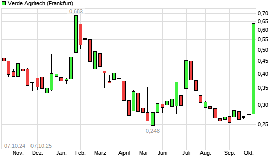 Mit dem Anstieg auf 0,59 EUR hat die Verde Agritech-Aktie (ISIN SGXZ27777630) am 06.10.2025 ein neues 6-Monats-Hoch erreicht und damit den Kurs vom 15.07.2025 eingestellt.