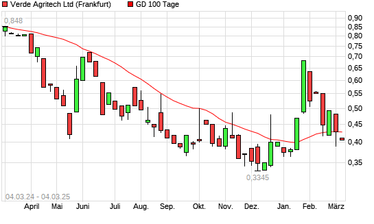 Mit dem Rücksetzer auf 0,41 EUR hat die Verde Agritech-Aktie am 03.03.2025 die 100-Tage-Linie nach unten gekreuzt.