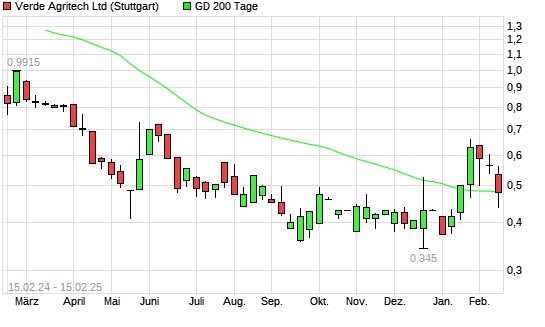 Mit dem Rücksetzer auf 0,45 EUR hat die Verde Agritech-Aktie am 14.02.2025 die 200-Tage-Linie nach unten gekreuzt.