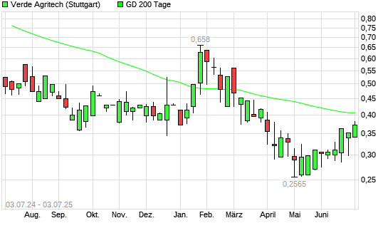 Mit dem Rücksetzer auf 0,38 EUR hat die Verde Agritech-Aktie am 02.07.2025 die 200-Tage-Linie nach unten gekreuzt.