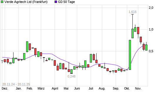 Mit dem Rücksetzer auf 0,61 EUR hat die Verde Agritech-Aktie am 19.11.2025 die 50-Tage-Linie nach unten gekreuzt.Die Verde Agritech-Aktie befindet sich seit dem 06.10.2025 im langfristigen ...weiterlesen