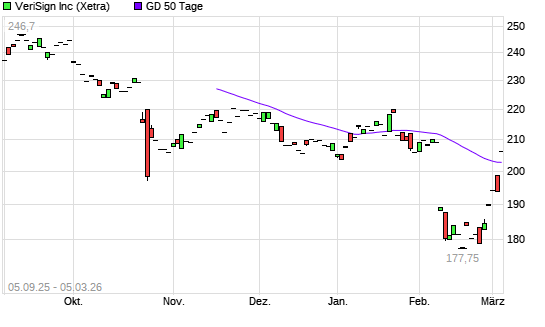 Mit dem Anstieg auf 201,50 EUR hat die Verisign-Aktie am 04.03.2026 die 50-Tage-Linie nach oben gekreuzt.