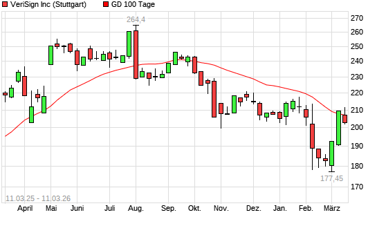 Mit dem Rücksetzer auf 203,30 EUR hat die Verisign-Aktie am 10.03.2026 die 100-Tage-Linie nach unten gekreuzt.
