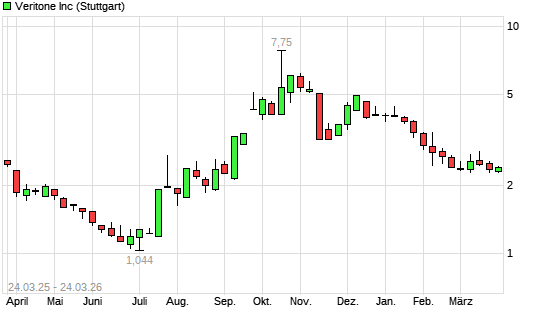 Mit dem Rücksetzer auf 2,29 EUR hat die Veritone-Aktie (ISIN US92347M1009) am 23.03.2026 ein neues 6-Monats-Tief erreicht und damit den Kurs vom 02.03.2026 eingestellt.