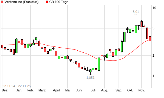 Mit dem Rücksetzer auf 3,29 EUR hat die Veritone-Aktie am 21.11.2025 die 100-Tage-Linie nach unten gekreuzt.