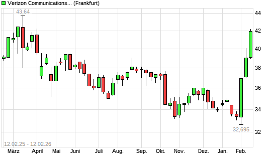 Mit dem Anstieg auf 41,03 EUR hat die Verizon-Aktie (ISIN US92343V1044) am 11.02.2026 ein neues 6-Monats-Hoch erreicht und damit den Kurs vom 04.02.2026 eingestellt.