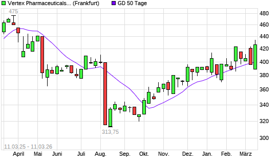 Mit dem Anstieg auf 428,90 EUR hat die Vertex Pharmaceuticals-Aktie am 10.03.2026 die 50-Tage-Linie nach oben gekreuzt.