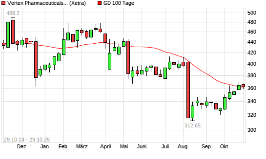 Mit dem Rücksetzer auf 359,75 EUR hat die Vertex Pharmaceuticals-Aktie am 28.10.2025 die 100-Tage-Linie nach unten gekreuzt.
