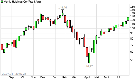 Mit dem Anstieg auf 125,58 EUR hat die Vertiv Holdings-Aktie (ISIN US92537N1081) am 29.07.2025 ein neues 6-Monats-Hoch erreicht und damit den Kurs vom 10.02.2025 eingestellt.