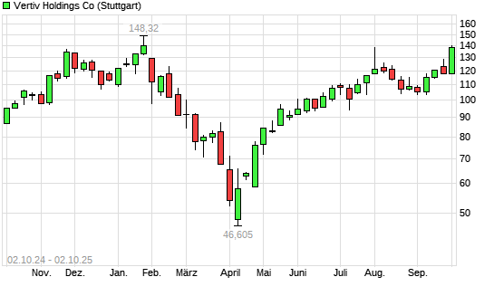Mit dem Anstieg auf 137,86 EUR hat die Vertiv Holdings-Aktie (ISIN US92537N1081) am 01.10.2025 ein neues 6-Monats-Hoch erreicht und damit den Kurs vom 31.07.2025 eingestellt.