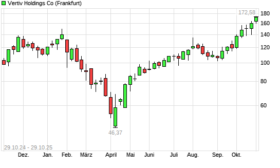 Mit dem Anstieg auf 165,00 EUR hat die Vertiv Holdings-Aktie (ISIN US92537N1081) am 28.10.2025 ein neues All-Time-High erreicht und damit den Kurs vom 27.10.2025 eingestellt.