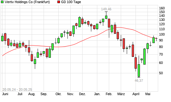 Mit dem Rücksetzer auf 90,29 EUR hat die Vertiv Holdings-Aktie am 19.05.2025 die 100-Tage-Linie nach unten gekreuzt.