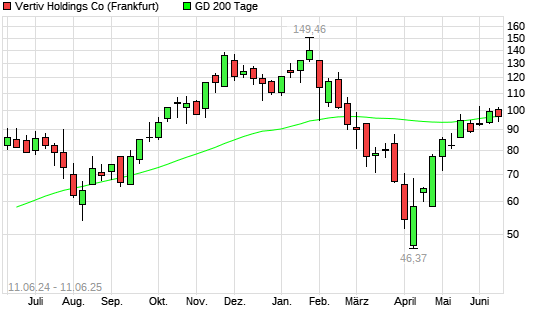 Mit dem Rücksetzer auf 94,73 EUR hat die Vertiv Holdings-Aktie am 10.06.2025 die 200-Tage-Linie nach unten gekreuzt.