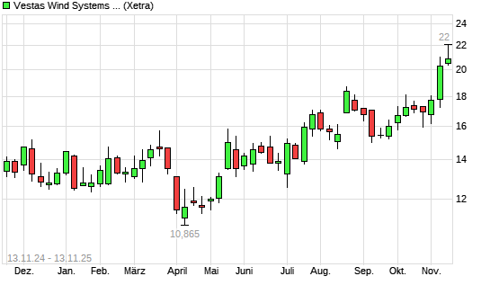 Mit dem Anstieg auf 21,85 EUR hat die Vestas-Aktie (ISIN DK0061539921) am 12.11.2025 ein neues 12-Monats-Hoch erreicht und damit den Kurs vom 11.11.2025 eingestellt.