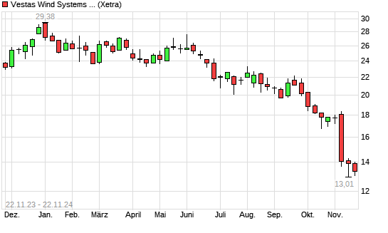 Mit dem Rücksetzer auf 13,29 EUR hat die Vestas-Aktie (ISIN DK0061539921) am 21.11.2024 ein neues 3-Jahres-Tief erreicht und damit den Kurs vom 14.11.2024 eingestellt.