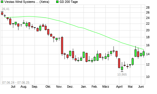 Mit dem Anstieg auf 14,84 EUR hat die Vestas-Aktie am 06.06.2025 die 200-Tage-Linie nach oben gekreuzt.