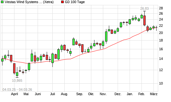 Mit dem Rücksetzer auf 20,77 EUR hat die Vestas-Aktie am 03.03.2026 die 100-Tage-Linie nach unten gekreuzt.