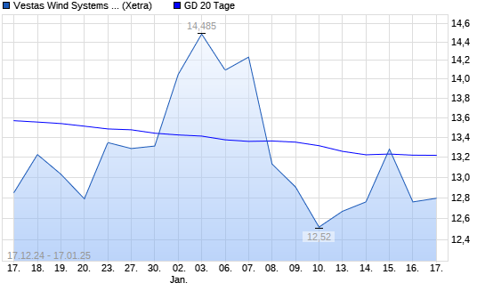 Mit dem Rücksetzer auf 12,91 EUR hat die Vestas-Aktie am 16.01.2025 die 20-Tage-Linie nach unten gekreuzt.