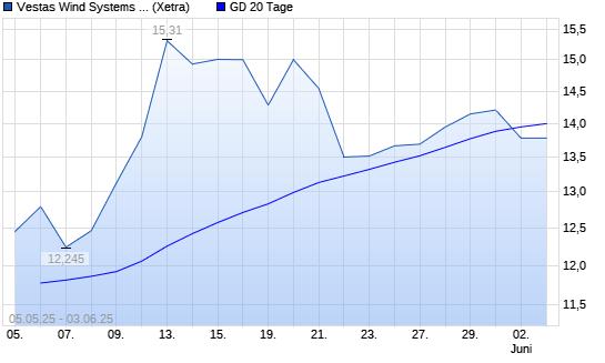 Mit dem Rücksetzer auf 13,91 EUR hat die Vestas-Aktie am 02.06.2025 die 20-Tage-Linie nach unten gekreuzt.