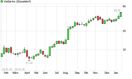 Mit dem Anstieg auf 37,95 EUR hat die ViaSat-Aktie (ISIN US92552V1008) am 15.01.2026 ein neues 12-Monats-Hoch erreicht und damit den Kurs vom 07.01.2026 eingestellt.