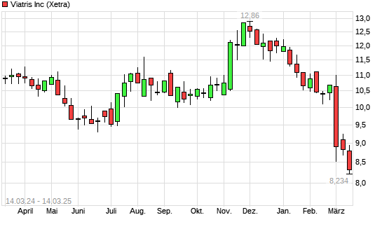 Mit dem Rücksetzer auf 8,38 EUR hat die Viatris-Aktie (ISIN US92556V1061) am 13.03.2025 ein neues 12-Monats-Tief erreicht und damit den Kurs vom 11.03.2025 eingestellt.