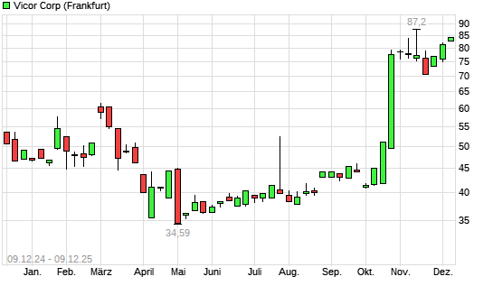Mit dem Anstieg auf 83,68 EUR hat die Vicor-Aktie (ISIN US9258151029) am 08.12.2025 ein neues 12-Monats-Hoch erreicht und damit den Kurs vom 04.12.2025 eingestellt.