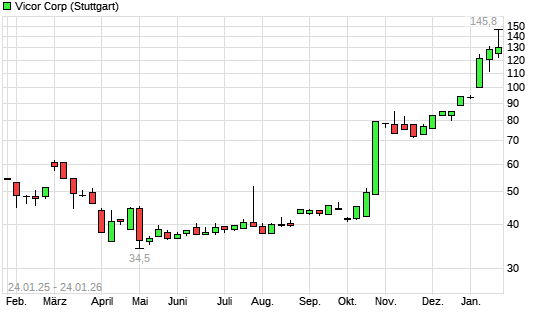 Mit dem Anstieg auf 143,00 EUR hat die Vicor-Aktie (ISIN US9258151029) am 23.01.2026 ein neues 3-Jahres-Hoch erreicht und damit den Kurs vom 22.01.2026 eingestellt.