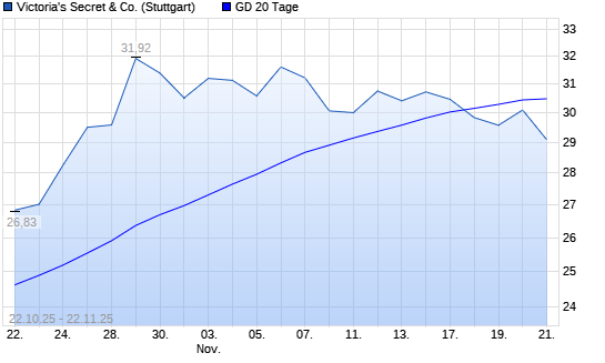Mit dem Rücksetzer auf 28,94 EUR hat die Victoria's Secret & Co-Aktie am 21.11.2025 die 20-Tage-Linie nach unten gekreuzt.