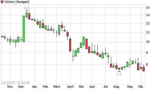 Mit dem Rücksetzer auf 7,25 EUR hat die Victrex-Aktie (ISIN GB0009292243) am 10.10.2025 ein neues All-Time-Low erreicht und damit den Kurs vom 07.08.2025 eingestellt.