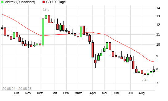 Mit dem Rücksetzer auf 7,80 EUR hat die Victrex-Aktie am 29.08.2025 die 100-Tage-Linie nach unten gekreuzt.