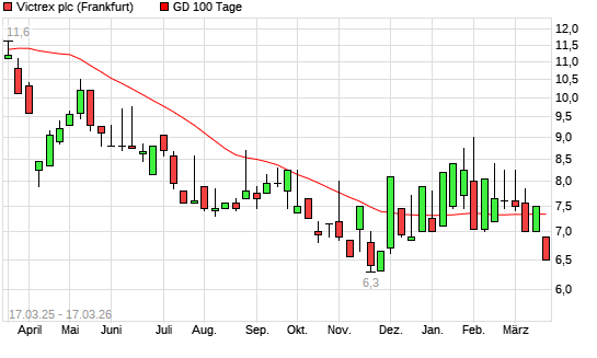Mit dem Rücksetzer auf 6,90 EUR hat die Victrex-Aktie am 16.03.2026 die 100-Tage-Linie nach unten gekreuzt.